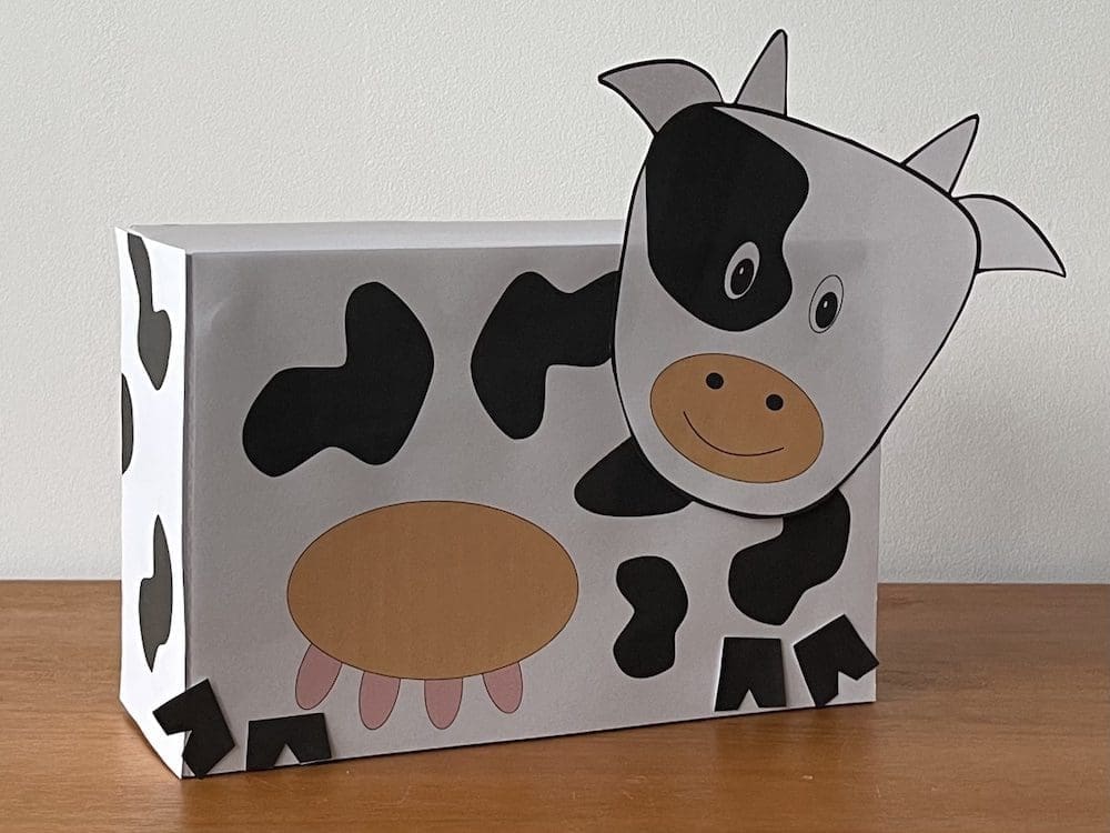 Naast de koe surprise printable heb je ook een schoenendoos nodig om deze makkelijke surprise te maken. Deze schoenendoos beplak je met het koeienvlekken papier van de printable. (Vergeet niet om eerst het cadeautje in de schoenendoos te verstoppen.) De printable van het hoofd print je op stevig papier uit, knip je uit en plak je vervolgens op de doos. Zo makkelijk is het!
