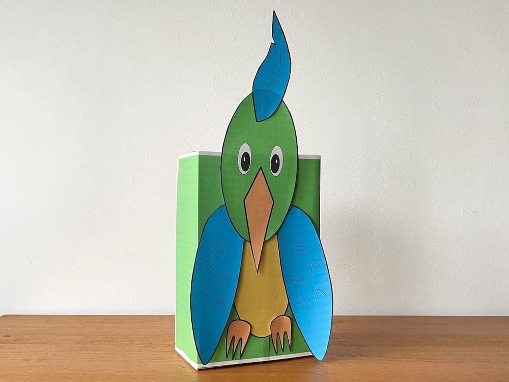 Naast de vogel surprise printable heb je ook een schoenendoos nodig om deze makkelijke surprise te maken. Deze schoenendoos beplak je met het groene papier van de printable. (Vergeet niet om eerst het cadeautje in de schoenendoos te verstoppen.) De rest van de printable print je op stevig papier uit, knip je uit en plak je vervolgens op de doos. Zo makkelijk is het!