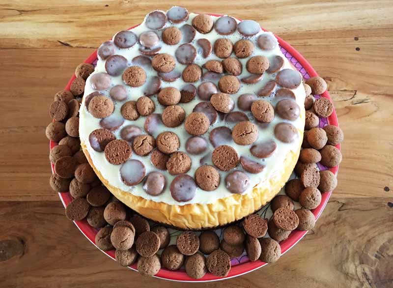 Smelt de witte chocolade. Dit kan in de magnetron, maar dan moet je wel om de 20 seconde even roeren. Je kunt het ook in een kom boven een pan met kokend water laten smelten. Meng vervolgens de gesmolten witte chocolade met de 150 ml slagroom. Mik er uiteindelijk nog een handje, of twee handjes, pepernoten door en giet het mengsel over de cheesecake. Eigenlijk had ik er ook nog 125 gram mascarpone aan toe willen voegen, maar bij het bereiden kwam ik er achter dat de mascarpone niet in mijn koelkast stond, maar nog in de supermarkt. Als een echte bakster fabriceer ik een nieuw idee, of eigenlijk, ik laat de mascarpone gewoon achterwege.
