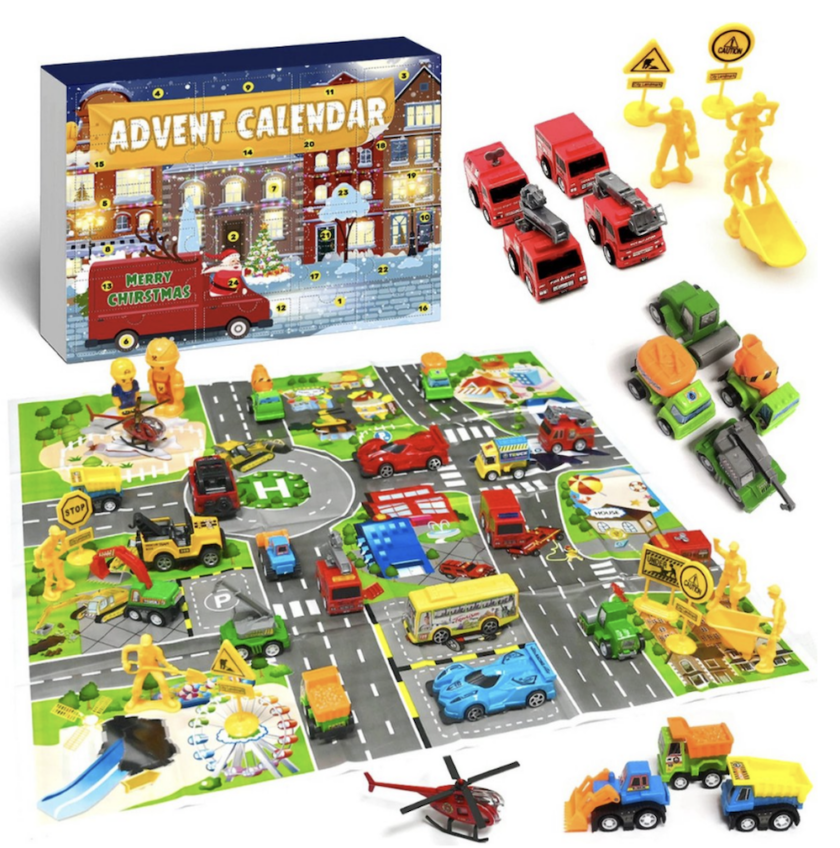 Geen merk, niet heel goedkoop maar wel erg leuk is deze adventskalender met auto’s en verkeer. Deze adventskalender is gevuld met auto’s, racewagens, brandweerwagens en zelfs een helikopter. En er is ook nog een speelkaart meegeleverd, waar je kleintje de auto’s overheen kan laten crossen.