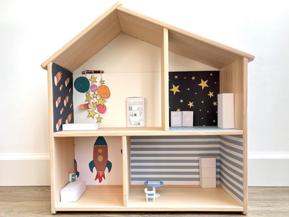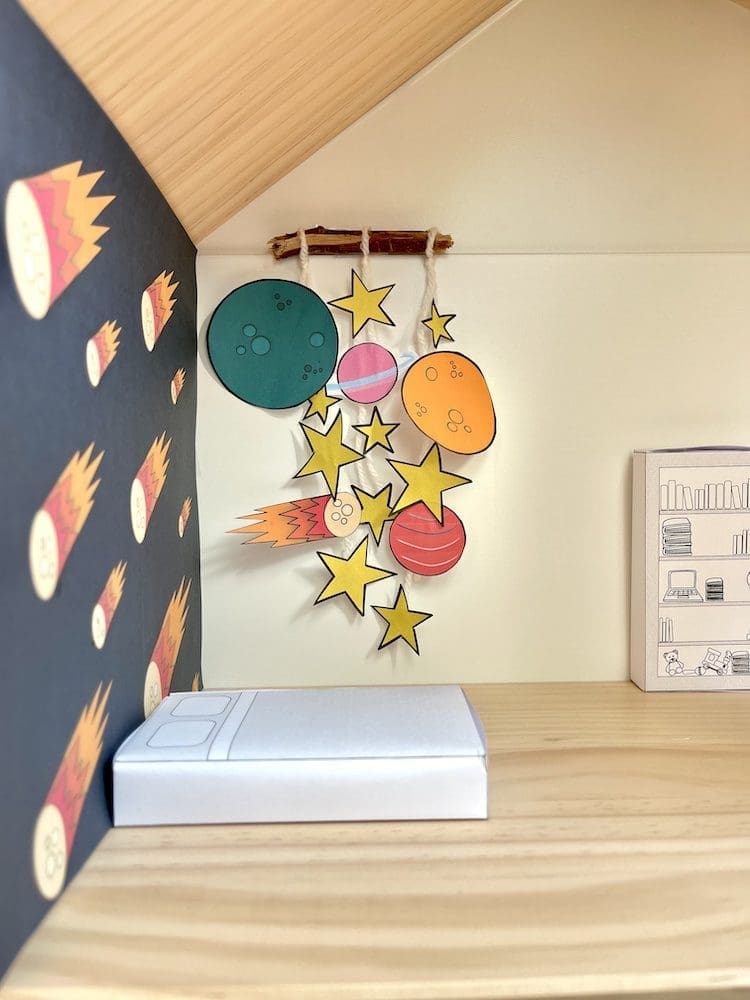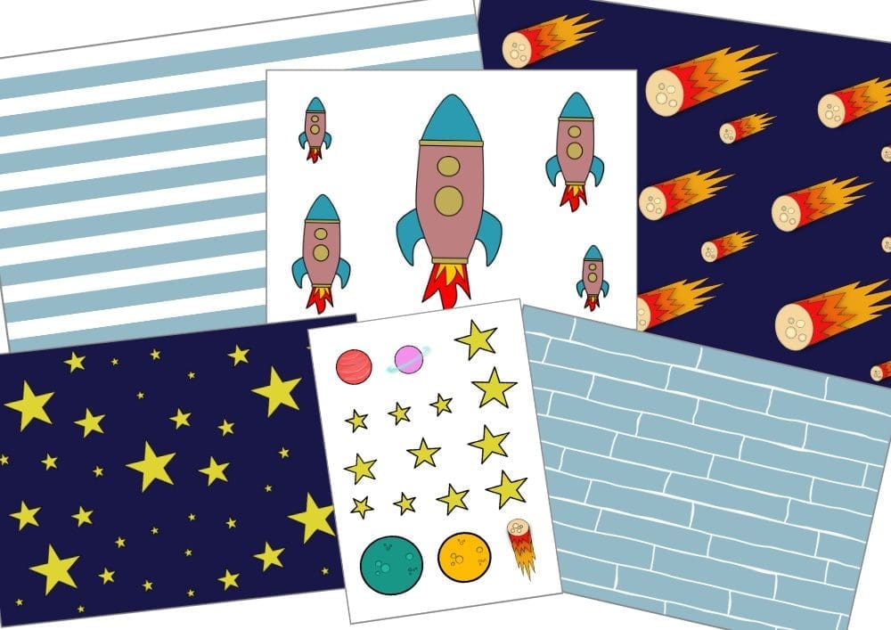 En ook het ruimtevaart poppenhuis behang kun je bestellen via onze printshop. Nadat je betaald hebt, ontvang je deze zes verschillende printables in je mailbox. Je kiest er zelf voor welke je uitprint en hoe vaak. Je print de vellen behang uit op A4 papier en afhankelijk van je poppenhuis, knip je het behang zelf op maat.