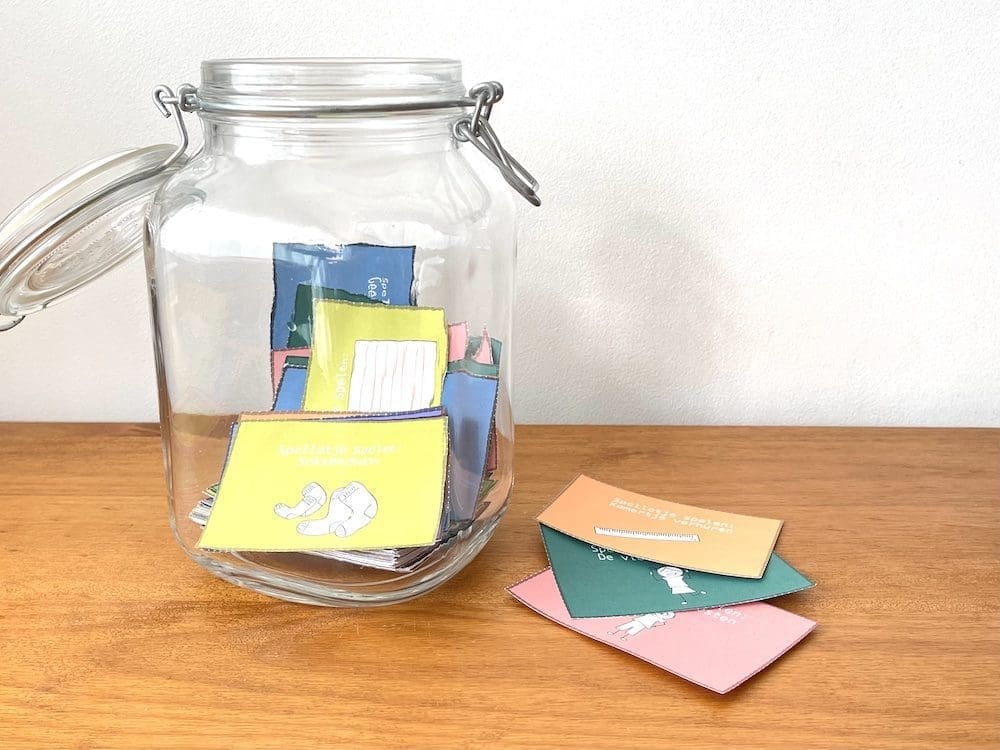 Oh, en willen de kinderen toch ook binnenspelletjes uit de spelletjeskast als keuze in de antio-verveel-pot hebben, dan zitten er ook nog kaartjes bij waar zelf een spelletje op geschreven kan worden.