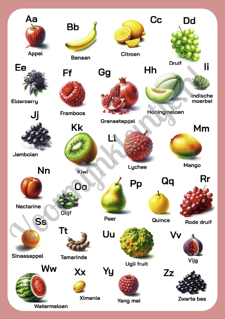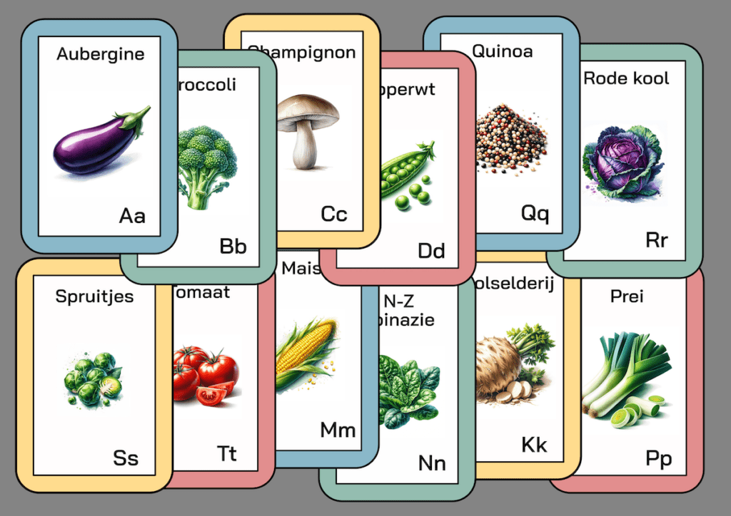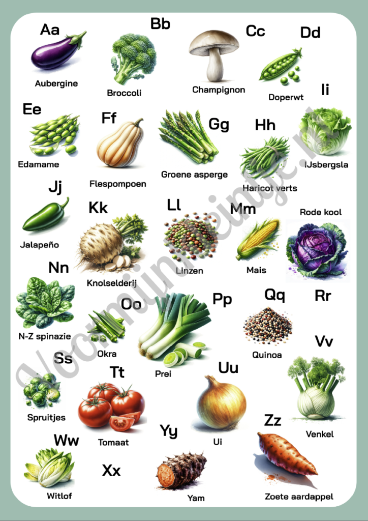 Onze set bestaat uit prachtig ontworpen kaarten en posters die elk een letter van het alfabet koppelen aan een specifieke groente en fruit. Van A voor Appel tot Z voor Zoete aardappel, elke kaart is niet alleen leuk om naar te kijken, maar ook een bron van voedingswijsheid die jonge kinderen helpt om gezonde eetkeuzes te waarderen.