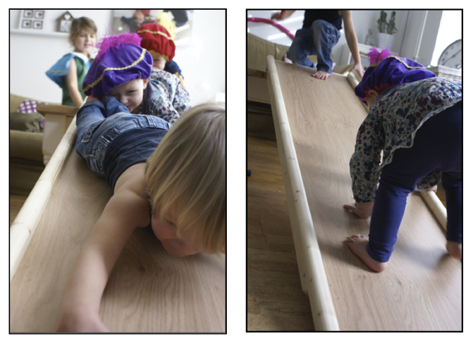 Wat hebben mijn kinderen een lol met de speelplank oftewel binnen glijbaan! Inmiddels is de plank al behoorlijk ingegleden. Het is verbazingwekkend hoe vaak een kind achter elkaar kan glijden en er elke keer weer even veel plezier in te hebben. En na 100x glijden beginnen de kleintjes hun fantasie erbij te gebruiken, bijvoorbeeld dat ze niet de lava in mogen glijden, of wat dacht je van krokodillen onderaan de glijbaan…