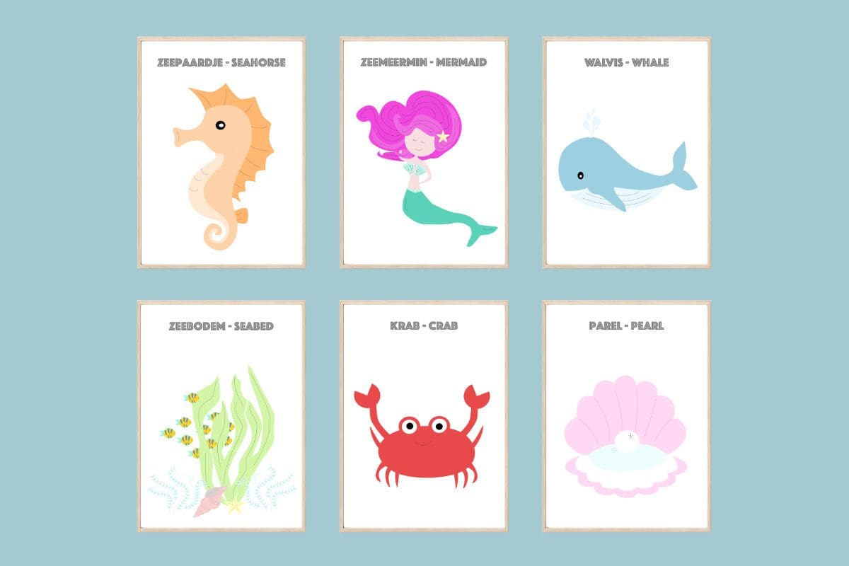 Wij hebben een prachtige zeemeermin poster set gemaakt! Deze zeemeermin poster set bestaat naast onze favoriete zeemeermin, ook uit een verzameling van mooie onderwaterwereld dieren en symbolen. Je kunt natuurlijk zelf kiezen welke poster je uit de set aan de muur hangt. We hebben een poster van een zeepaardje tot aan een walvis. En natuurlijk ontbreekt de zeemeermin zelf ook niet! Je kunt dus een eigen selectie van de posters ophangen, maar je kunt ze ook gewoon alle acht ophangen. Dan is de zeemeermin poster set compleet!