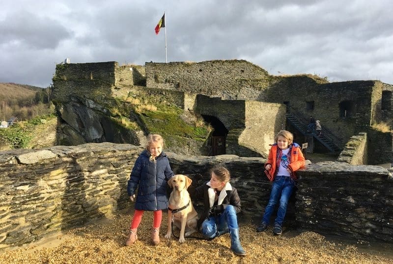 Ook deze vakantie hebben we onze hond bij ons. Dankzij het fijne vakantiehuis konden we de hond prima even achterlaten. Maar liever nemen we haar mee op onze uitstapjes en gelukkig is het Feodaal Kasteel van La Roche-en-Ardenne daar heel geschikt voor. De hond kan gewoon lekker meewandelen door de ruïnes, uiteraard wel aangelijnd. Alleen bij de vogelkooien zijn honden niet welkom. En ik vraag me ook af hoe ze dit in de zomer tijdens een valkenshow oplossen. Wellicht zijn honden daar ook niet welkom.
