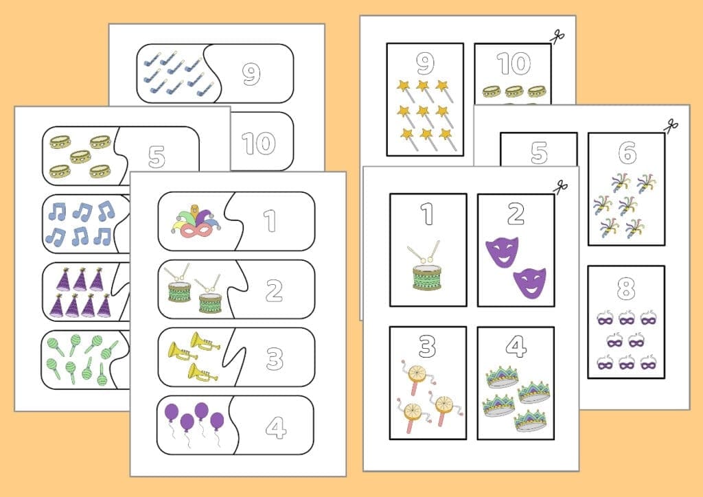 Telkaarten & telpuzzel tot 10 – Leren tellen wordt extra leuk met deze kleurrijke carnavalsprintables.