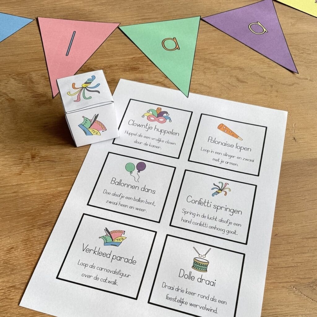 Dobbelsteen met beweegactiviteiten – Laat de kinderen actief meedoen met carnaval door te springen, dansen en bewegen.