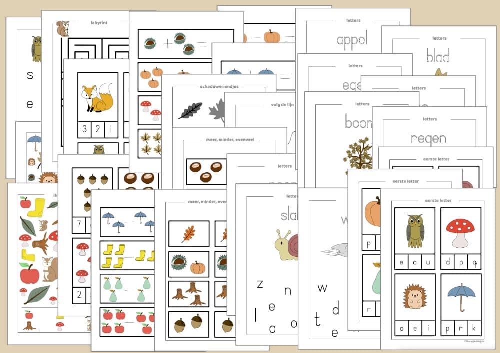 Deze herfst werkbladen voor peuters en kleuters zijn ideaal voor zelfstandig werken of kleine groepjes. Ze stimuleren de taal-, reken- en denkontwikkeling op een speelse manier.