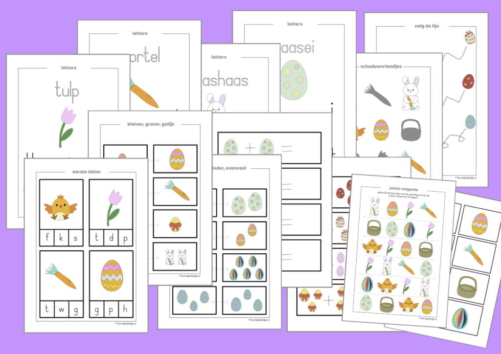 Met dit VVE Printable Pakket voor Pasen kunnen peuters en kleuters op een leuke en leerzame manier aan de slag met verschillende vaardigheden. Dit uitgebreide pakket zit vol educatieve spelletjes en werkbladen met een vrolijk paas-thema. Perfect voor thuis, de kinderopvang, peuterspeelzaal of het klaslokaal!